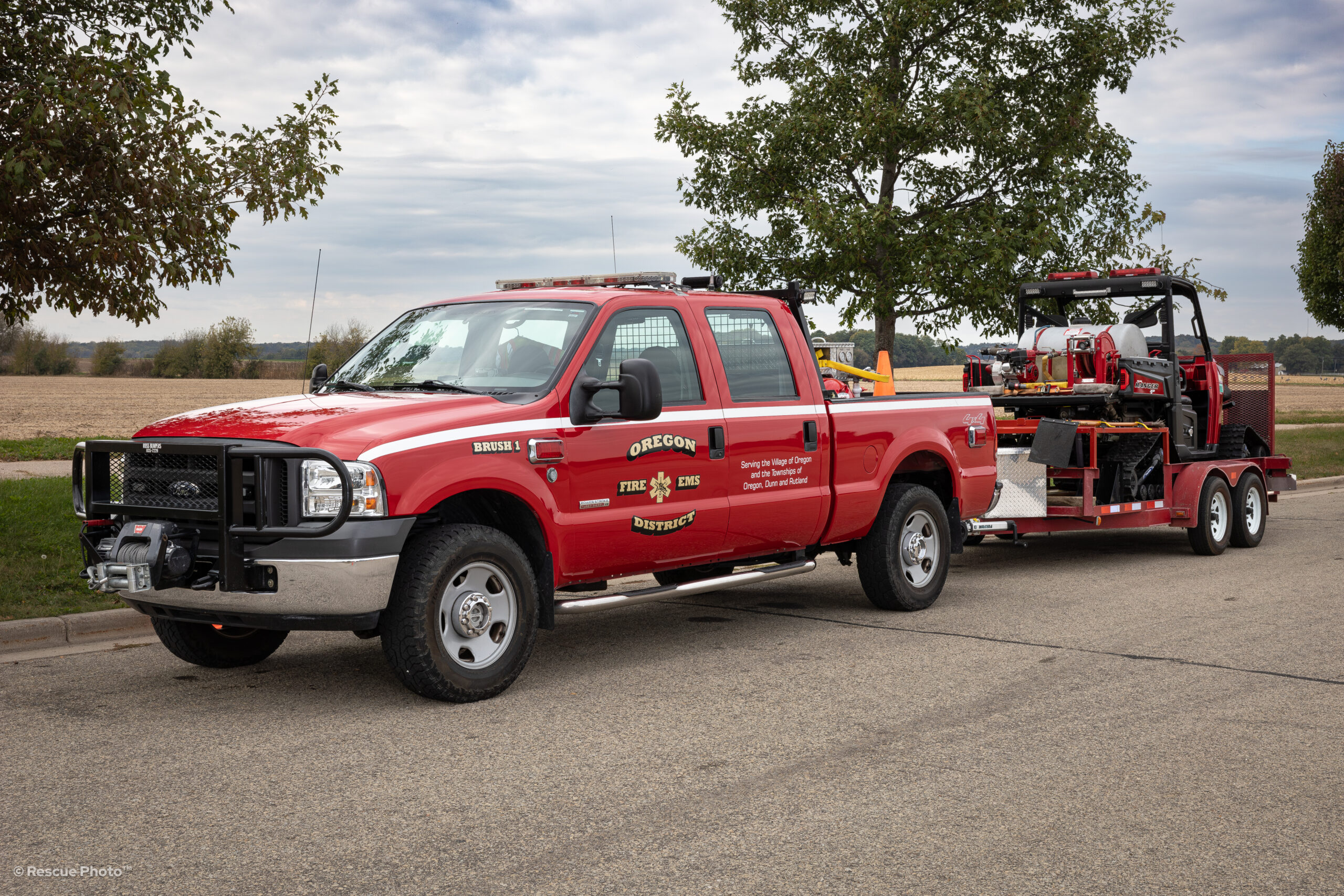 Brush 1 is a 2005 Ford F-250, which carries 100 gallons of water and pulls ATV-1. This vehicle responds to wildland (brush) fires.