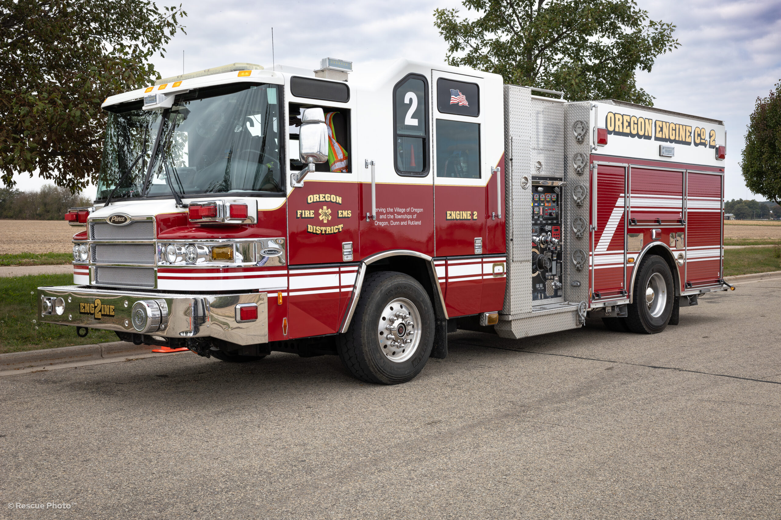 Engine 2 is a 2011 Pierce Quantum Pumper carrying 750 gallons of water with a 1500 gallon per minute pump. This apparatus serves as the primary engine for hydranted areas, and is the primary apparatus for motor vehicle crashes. This apparatus was previously served the City of Fitchburg up until the end of 2019.