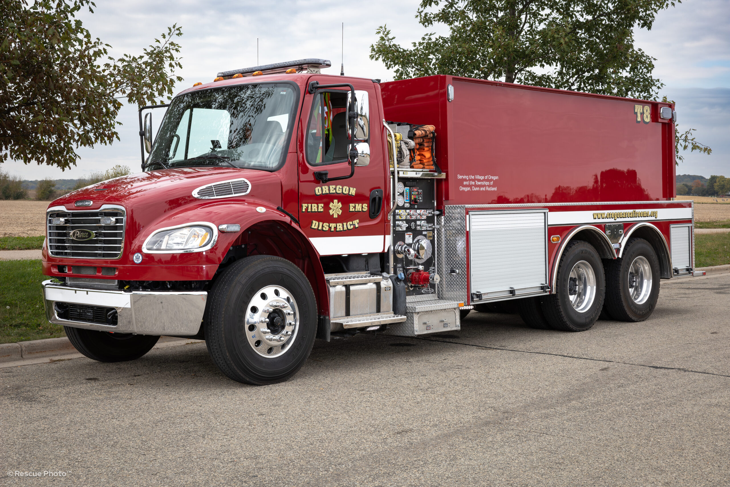 Tender 8 is a 2018 Pierce with a Freightliner chassis. This apparatus carries 3000 gallons of water to rural fires, and has a 1250 gallon per minute pump.